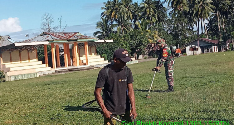 Babinsa Sangkub Laksanakan Bhakti Pembersihan Lapangan Sepak Bola