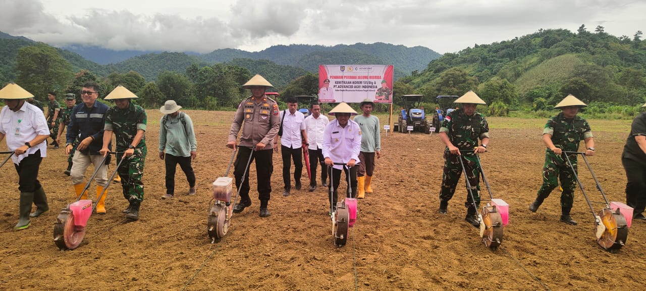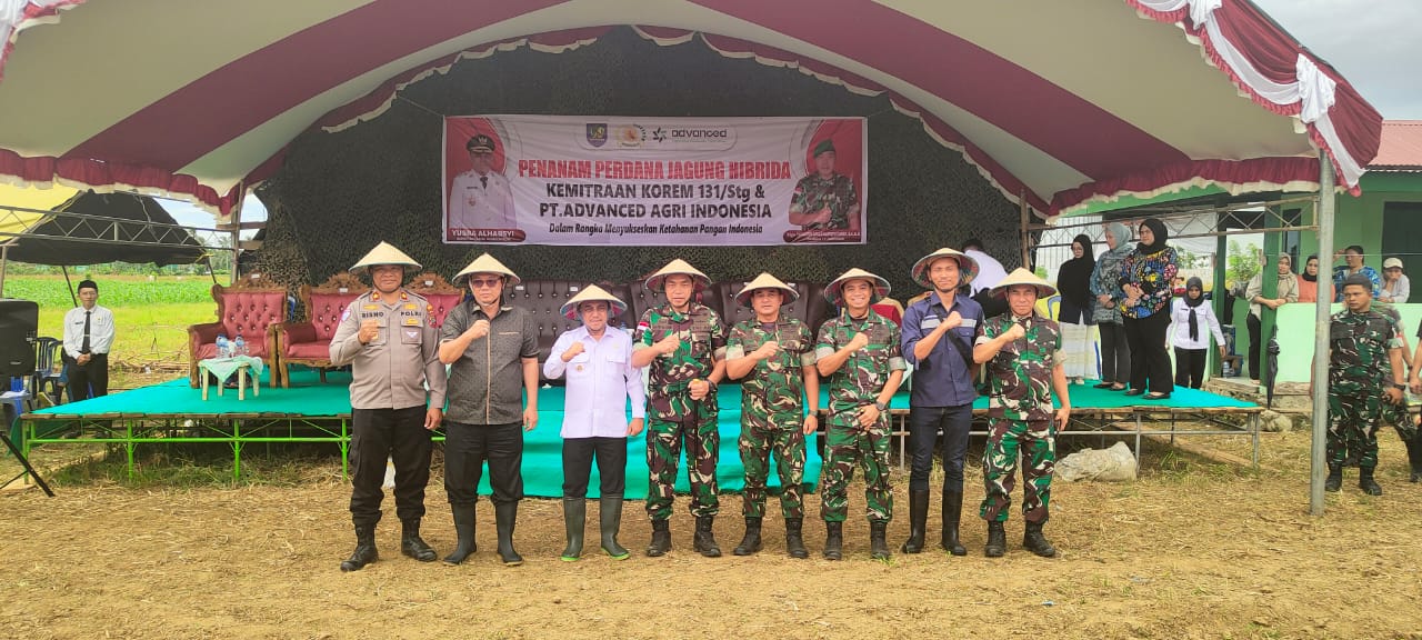B O L M O N G –Komandan Korem 131/Santiago Brigjen TNI Martin Susilo Murtopo Turnip SH MH, didampingi Dandim 1303/Bolaang Mongondow Letkol Inf Fahmil Harris SIP dan Bupati Bolaang Mongondow Yusra Alhabsy SE, menghadiri kegiatan penanaman perdana jagung hibrida kemitraan Korem 131/Santiago bersama PT. Advanced Agri Indonesia. Kegiatan berlangsung di lahan pertanian Desa Tuyat, Kecamatan Lolak, Kabupaten Bolaang Mongondow, Rabu (02/07/2025).