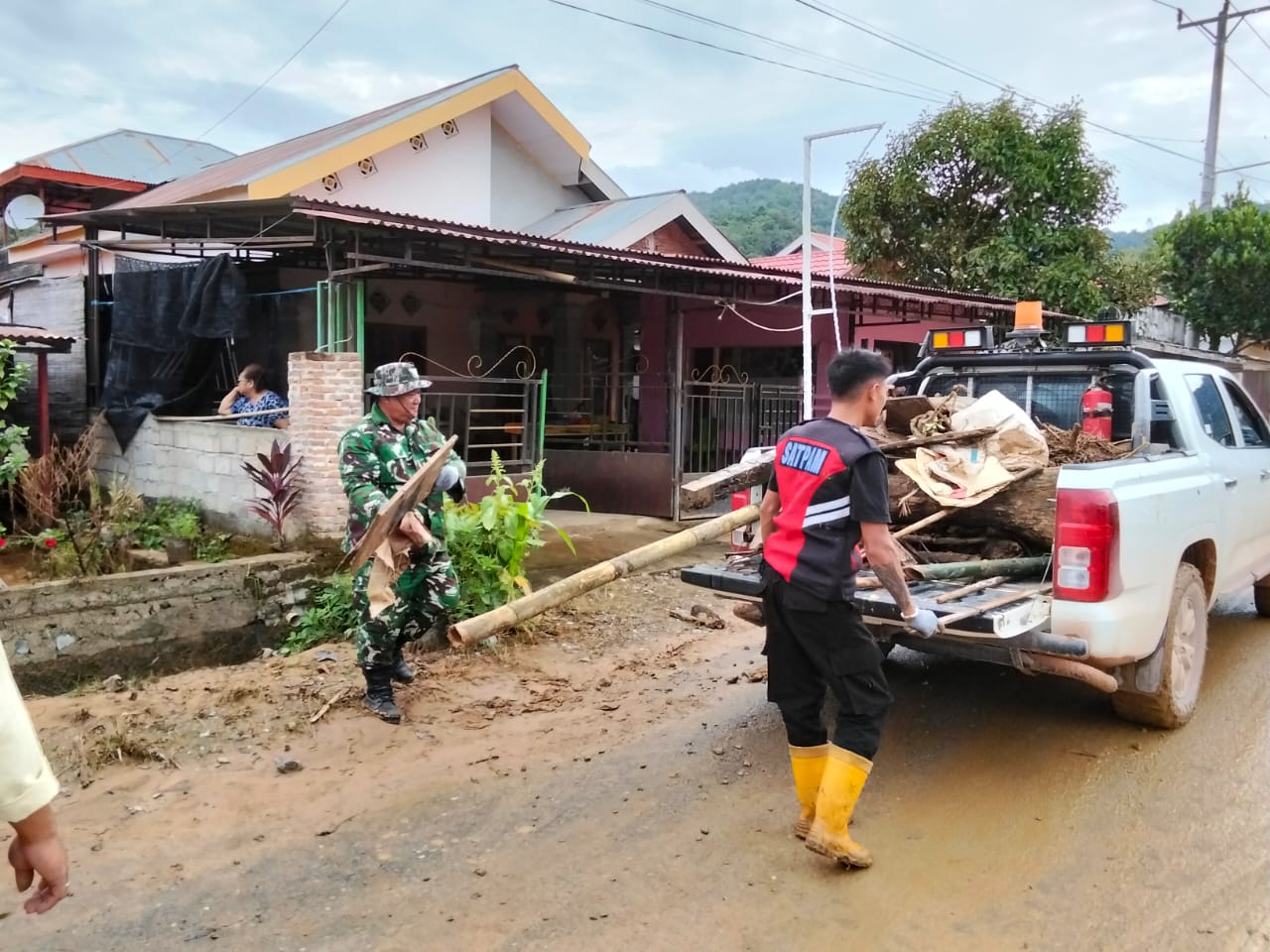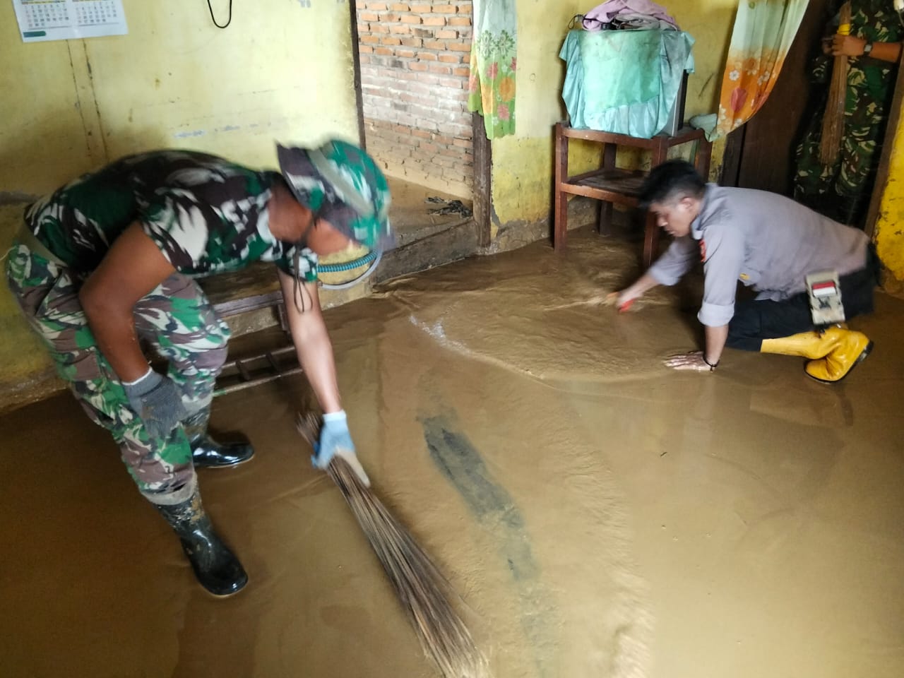 Dengan penuh semangat gotong royong, personel Koramil turun langsung masuk ke dalam rumah warga membantu membersihkan lantai yang dipenuhi lumpur tebal. Sementara itu, tim lainnya mengangkat kayu, bambu, dan material sampah yang terbawa arus banjir untuk dimuat ke kendaraan pengangkut.