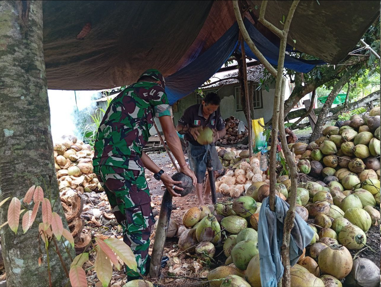 Babinsa Hadir Ringankan Beban Warga Desa Baturapa Dua, Ratusan Kelapa Dikupas Bersama