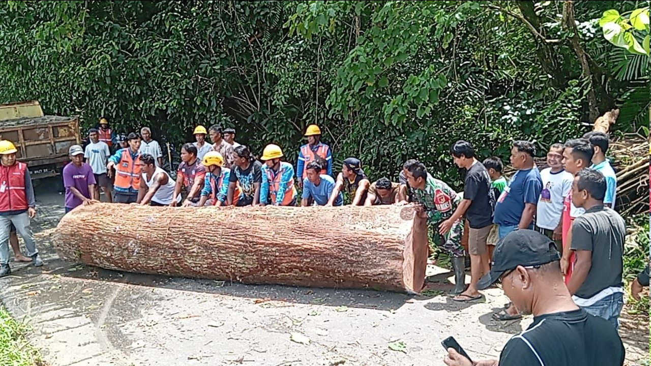 Dengan menggunakan mesin pemotong kayu, proses evakuasi pohon dilakukan secara gotong royong. Selain membersihkan batang dan ranting yang menutupi jalan, tim juga membantu penanganan tiang listrik yang patah akibat tertimpa pohon.