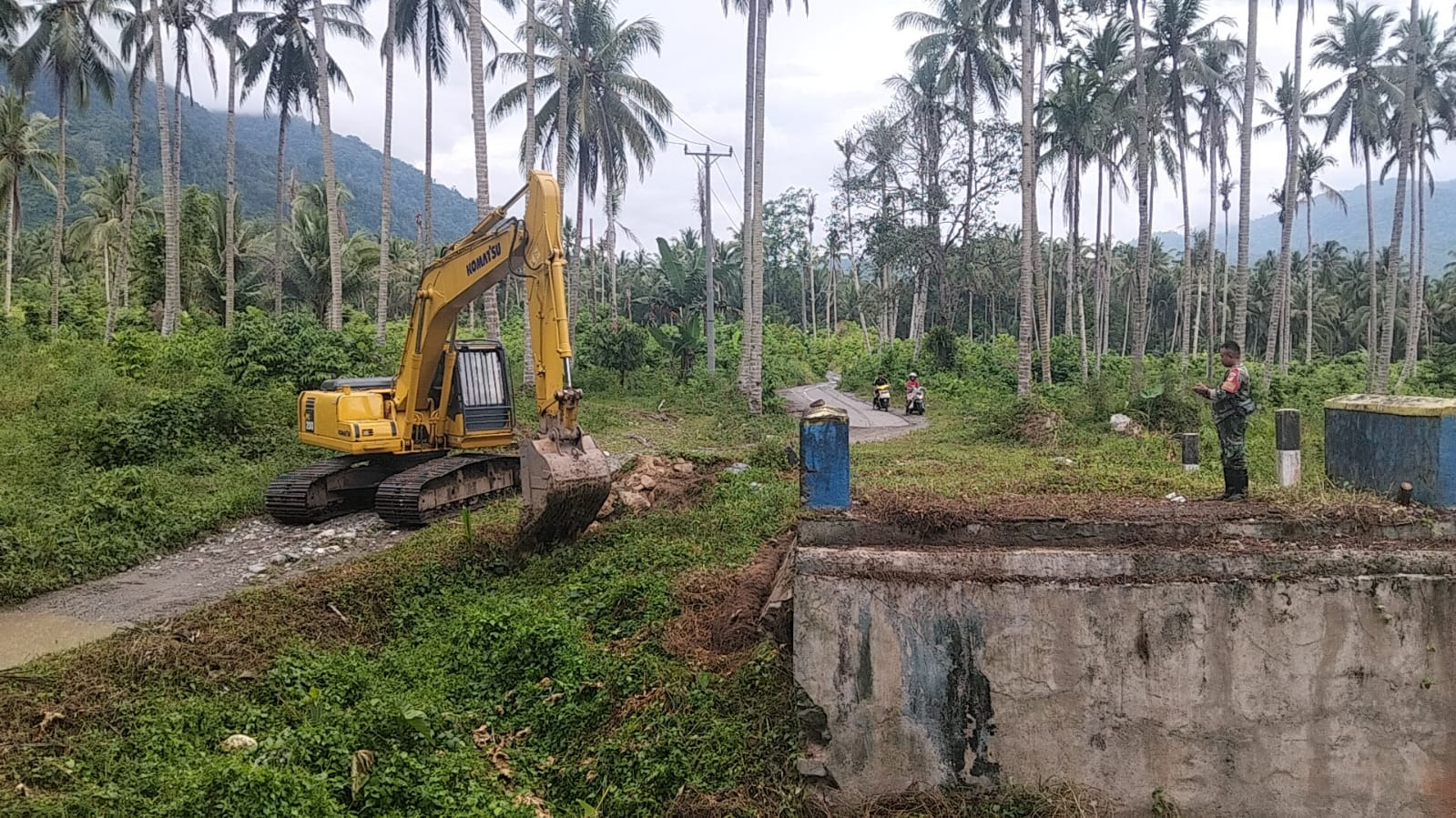 BOLAANG MONGONDOW – – Anggota TNI dari Koramil 1303-04/Lolayan Serda Afdal Mamonto, melakukan pengawasan langsung terhadap pengerjaan galian pondasi jembatan beton yang bertempat di Desa Mopusi Kecamatan Lolayan Kabupaten Bolaang Mongondow, Jumat (10/04/2026).