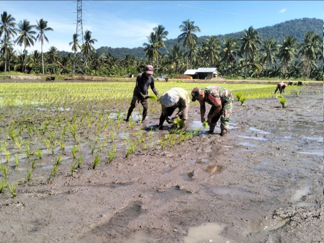 Dengan penuh semangat, Kopda Hairil bersama para petani terlihat bahu-membahu menanam bibit padi di lahan milik Bapak Randi Makalalag seluas kurang lebih satu hektar. Jenis padi yang ditanam adalah Serayu, yang dikenal memiliki hasil panen cukup baik dan sesuai dengan kondisi lahan setempat.