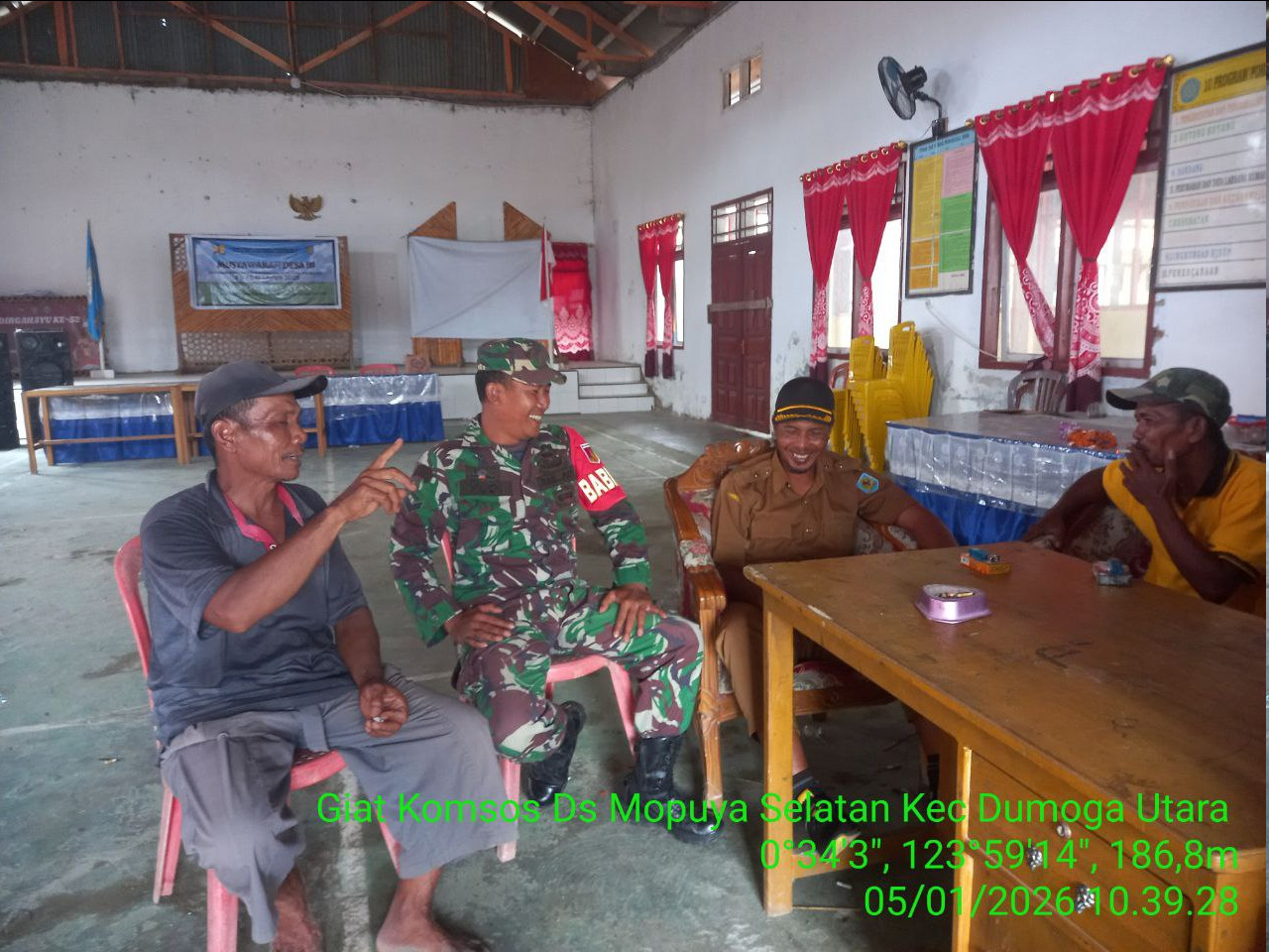 Kegiatan tersebut berlangsung pada Senin, (05/012026), sekitar pukul 10.00 Wita, yang bertempat di Kantor Desa Mopuya Selatan. Dalam balutan suasana santai dan penuh kekeluargaan, Babinsa tampak berbaur dan berdialog langsung dengan warga, menciptakan komunikasi dua arah yang hangat dan humanis.