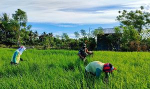 B O L M O N G – Upaya melakukan peningkatan hasil swasembada pangan, Serda Abdul Rajak anggota Babinsa Koramil 1303-12/Sangtombolang melakukan pemupukan tanaman jagung dilahan milik Bapak Stevan seluas 1 hektar dengan menggunakan bibit Bisi-2 yang berada di Desa Domisil Kecamatan Sangtombolang Kabupaten Bolmut, Kamis (18/07/2019).