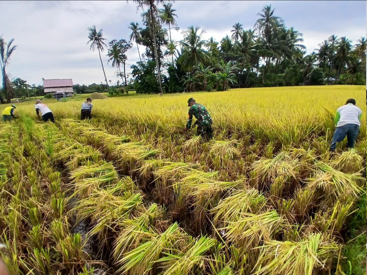 Bintara Pembina Desa atau Babinsa Koramil 1303-11/Lolak Serda Rusmanto Paputungan, melaksanakan kegiatan Pembinaan Ketahanan Wilayah (Bintahwil) dengan membantu masyarakat dalam panen padi sawah milik Bapak Ulum Paputungan. Kegiatan tersebut berlangsung di lahan seluas kurang lebih satu hektare dengan jenis padi “Pemburu”, yang menghasilkan sekitar empat ton gabah.