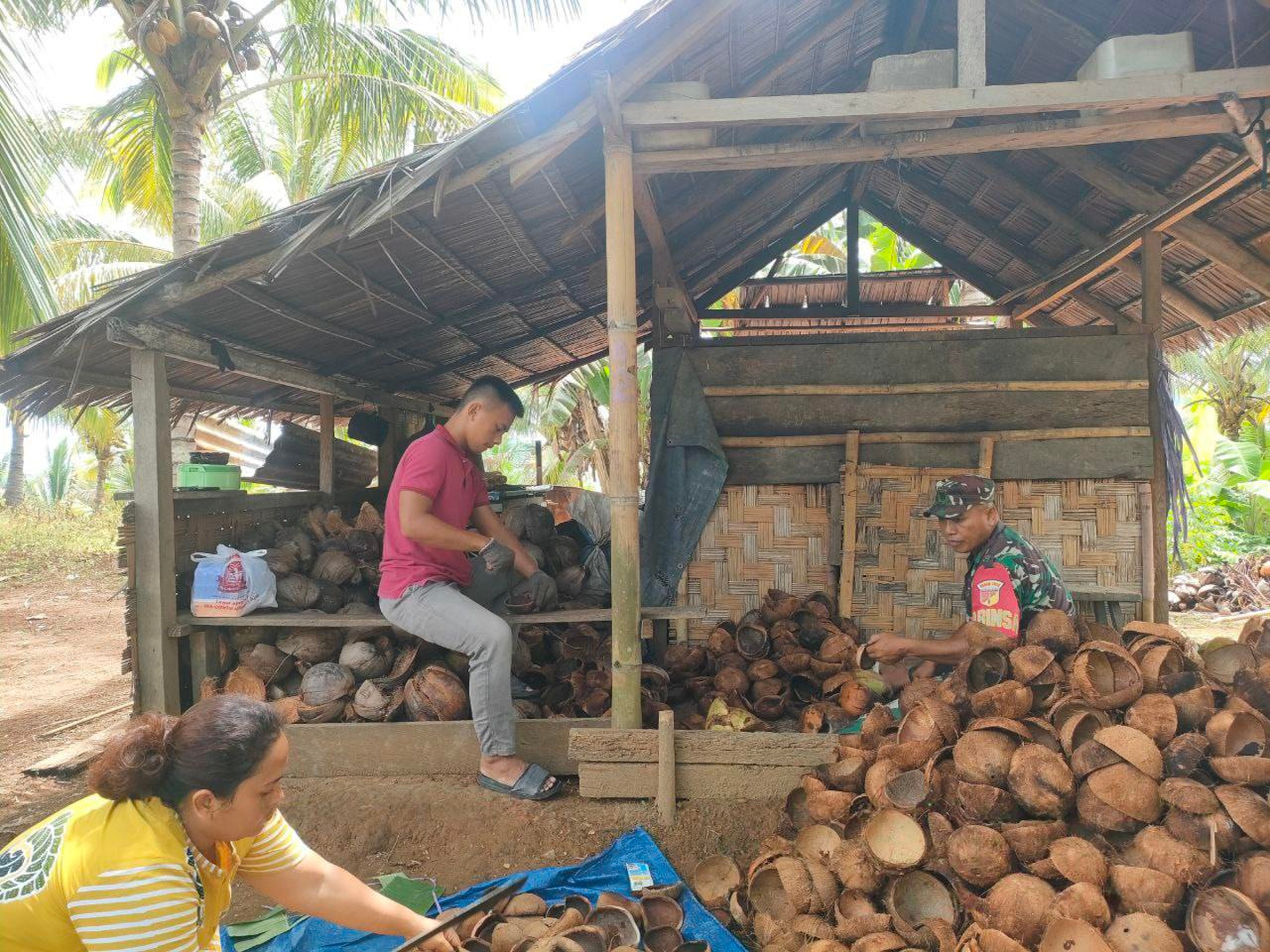 Dengan penuh semangat kebersamaan, Serma Syarif terlibat langsung dalam proses pemisahan kelapa dari tempurungnya. Aktivitas yang membutuhkan ketelitian dan tenaga itu menjadi bagian dari wujud nyata kemanunggalan TNI dan rakyat dalam mendukung penguatan ekonomi masyarakat desa.