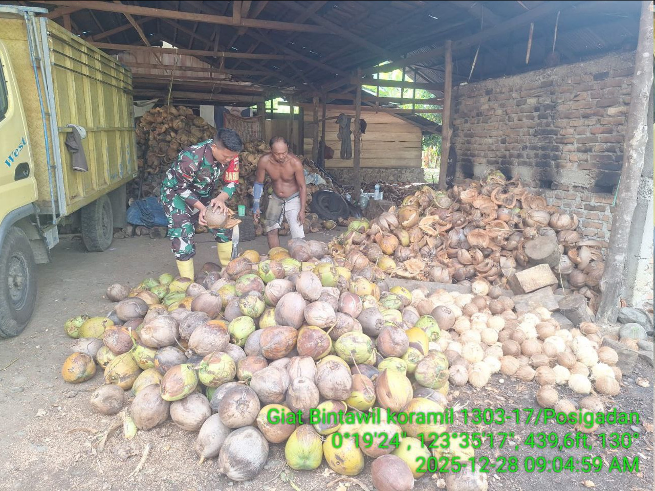 B O L S E L – – Bintara Pembina Desa atau Babinsa Koramil 1303-17/Posigadan Pratu Satria, melakukan pendampingan kepada warga dalam proses pengolahan kelapa menjadi kopra yang berada di Desa Menyambanga Kecamatan Posigadan Kabupaten Bolaang Mongondow Selatan, Minggu (28/12/2025).