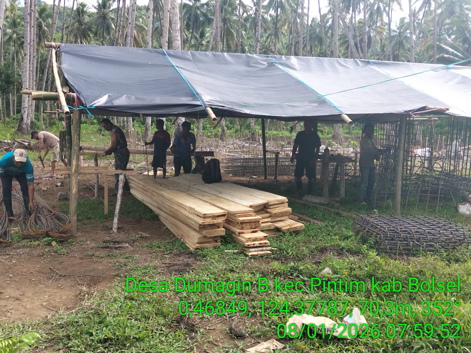 Pada Kamis (08/01/2026), proses pembangunan KDKMP yang berlokasi di Desa Dumagin B dengan luas lahan 35 x 30 meter dan luas bangunan 30 x 20 meter tersebut memasuki tahap pekerjaan pondasi dan pembesian. Kegiatan pembangunan dilaksanakan mulai pukul 07.30 hingga 16.30 Wita dengan melibatkan tujuh orang tenaga sipil serta satu personel TNI, yakni Babinsa Koptu Dedi Maramis.