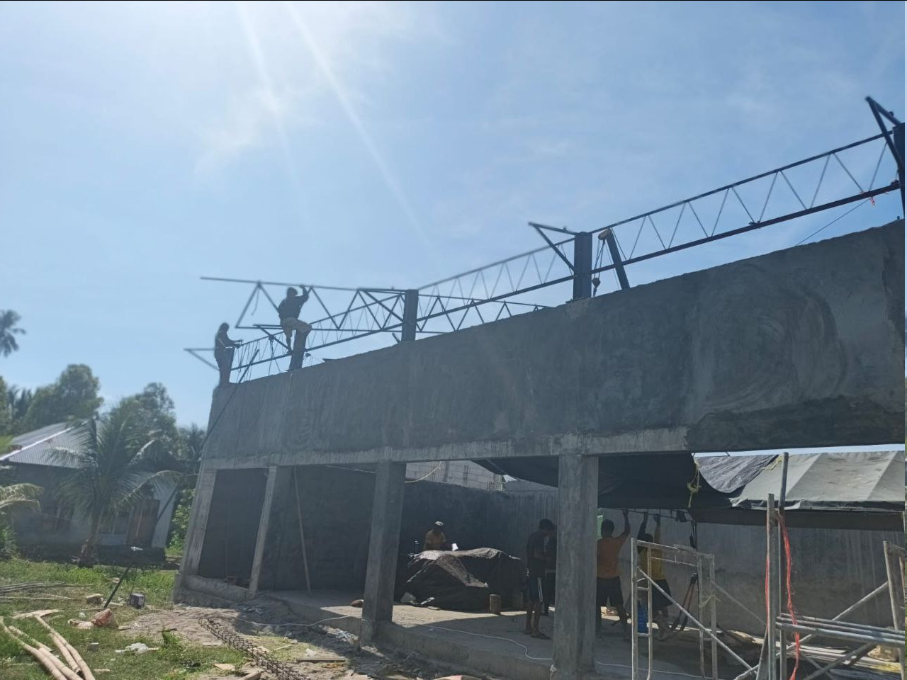 Pada pelaksanaan pekerjaan hari ini, kegiatan difokuskan pada pemasangan tiang rangka atap serta pekerjaan plester pada bagian gerai koperasi. Pekerjaan dilaksanakan mulai pukul 07.00 Wita hingga 17.00 Wita dengan melibatkan 15 orang tenaga kerja.