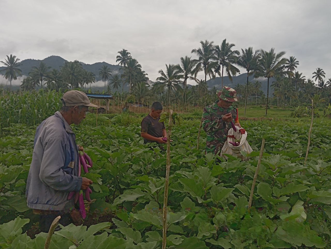 Babinsa Koramil 1303-03/Modayag Sertu Gatot Arif Riyanto, melaksanakan kegiatan Pembinaan Ketahanan Wilayah (Bintahwil) dengan membantu masyarakat melakukan panen terong di lahan milik Bapak Kasiyan, salah satu petani Desa Moonow. Kehadiran Babinsa di tengah aktivitas pertanian tersebut menjadi bentuk kepedulian dan dukungan nyata terhadap upaya peningkatan kesejahteraan masyarakat serta penguatan ketahanan pangan di wilayah binaan.