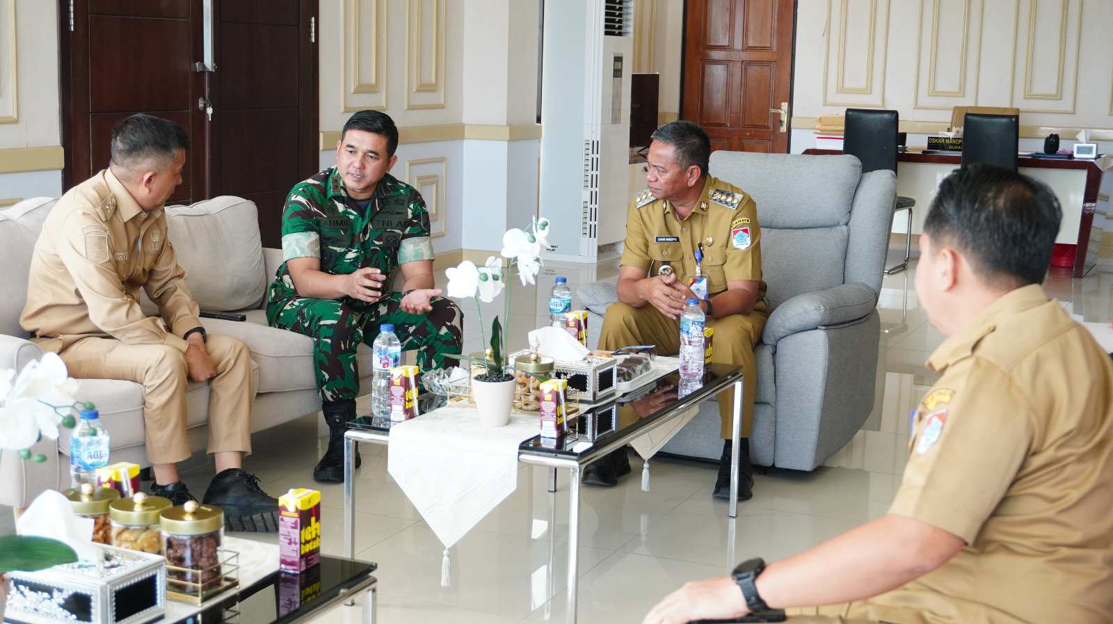 Dalam suasana penuh keakraban, Letkol Fahmil Harris menyampaikan komitmen TNI untuk terus berkoordinasi dan bekerja sama dengan pemerintah daerah dalam mewujudkan stabilitas wilayah yang aman dan kondusif.