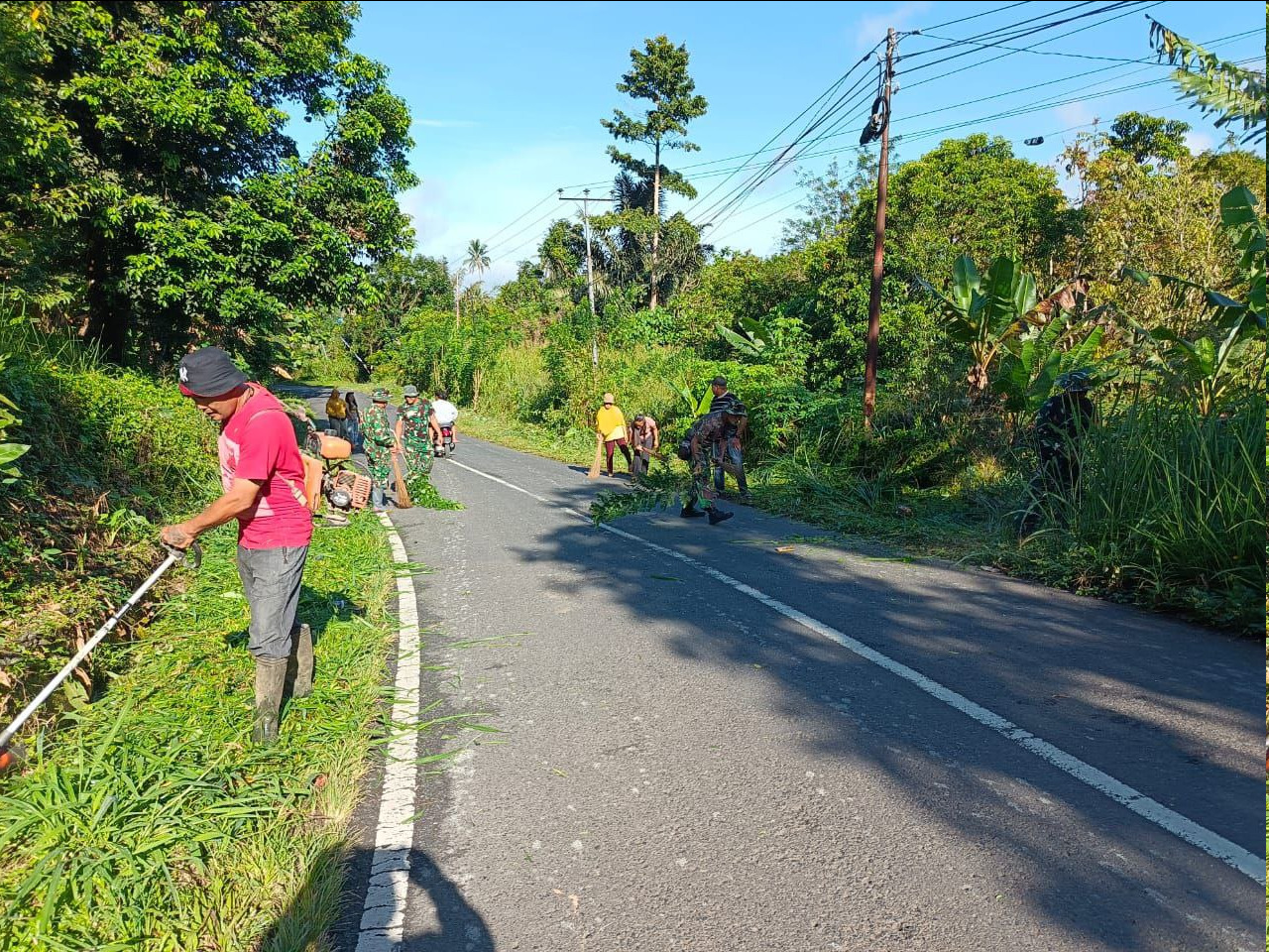 Suasana gotong royong tampak begitu hidup sejak pukul 07.30 Wita. Di bawah rindangnya pepohonan dan hamparan hijau di sepanjang jalan, para prajurit TNI, aparat desa, dan warga bahu membahu menebas rumput liar, membersihkan semak belukar, serta mengangkat sampah yang menumpuk di pinggiran jalan.