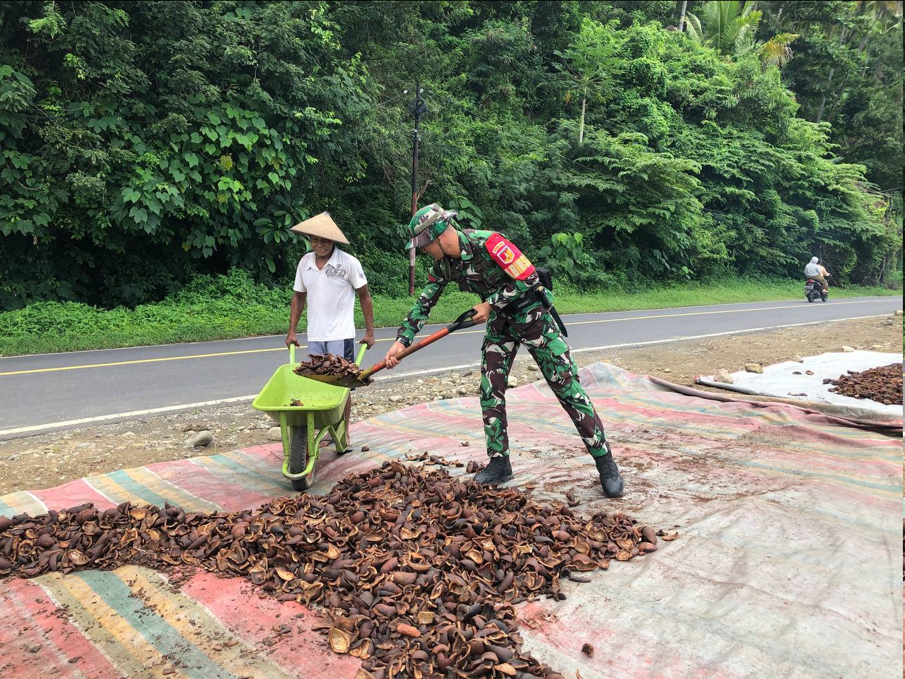 B O L T I M – – Di tepi jalan desa yang membelah hamparan hijau perbukitan, tampak pemandangan sederhana namun penuh makna. Seorang prajurit TNI berseragam loreng dengan penuh semangat membantu warga memindahkan kopra yang tengah dijemur. Tanpa sekat, tanpa jarak, kebersamaan itu menjadi potret nyata kemanunggalan TNI dengan rakyat.