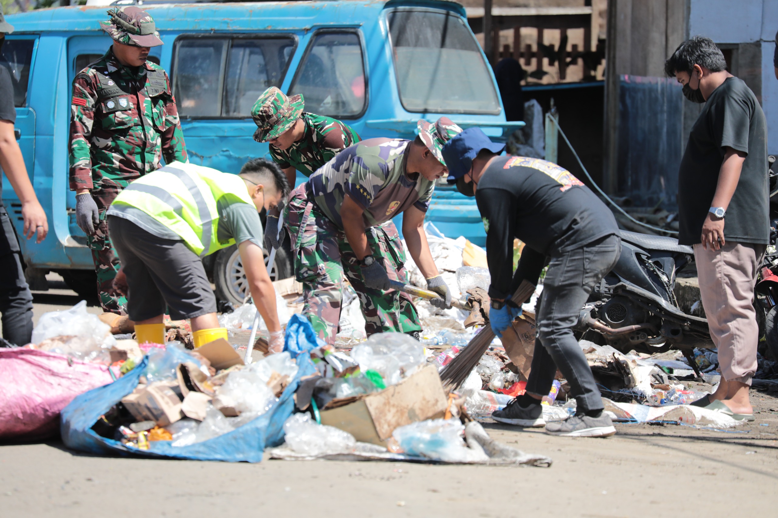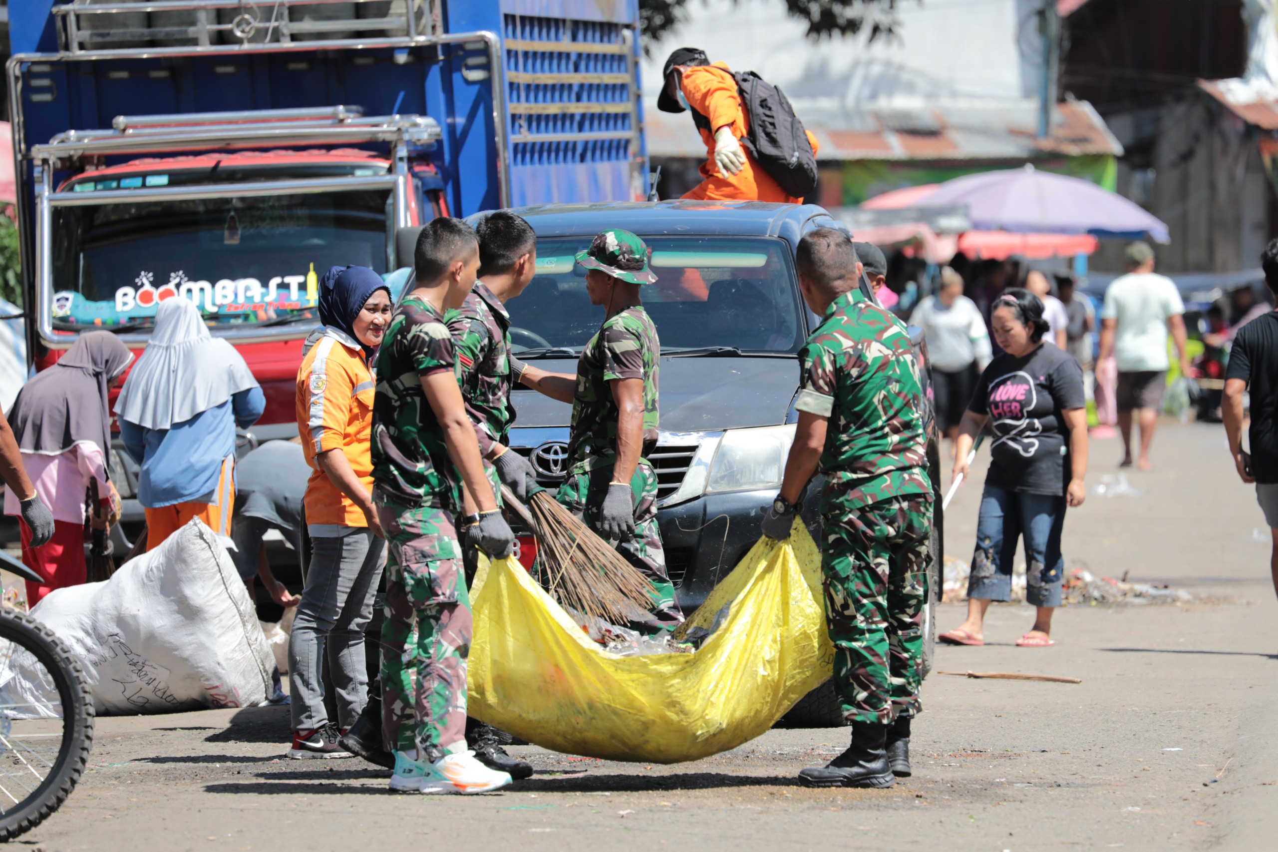 KOTAMOBAGU – – Di tengah hiruk-pikuk aktivitas pasar, pemandangan berbeda tersaji pagi ini. Sejumlah personel dari Komando Distrik Militer (Kodim) 1303/Bolaang Mongondow, Polres Kotamobagu, dan instansi terkait bergotong royong membersihkan tumpukan sampah yang menggunung dan mulai membusuk di kawasan pasar tradisional Serasi Kotamobagu. Dengan semangat kebersamaan, mereka bahu-membahu mengangkut sampah dan membersihkan area yang selama ini terabaikan.